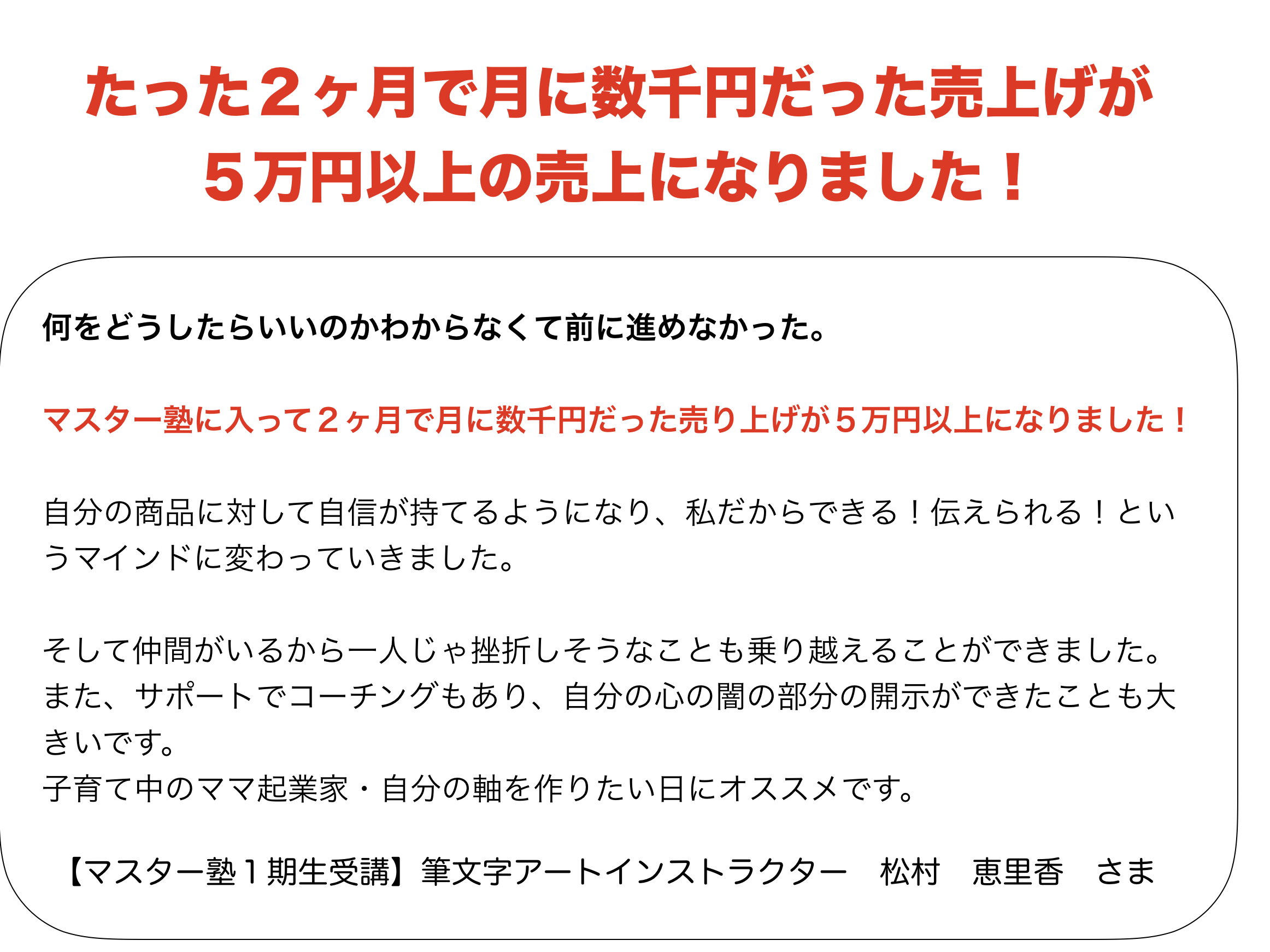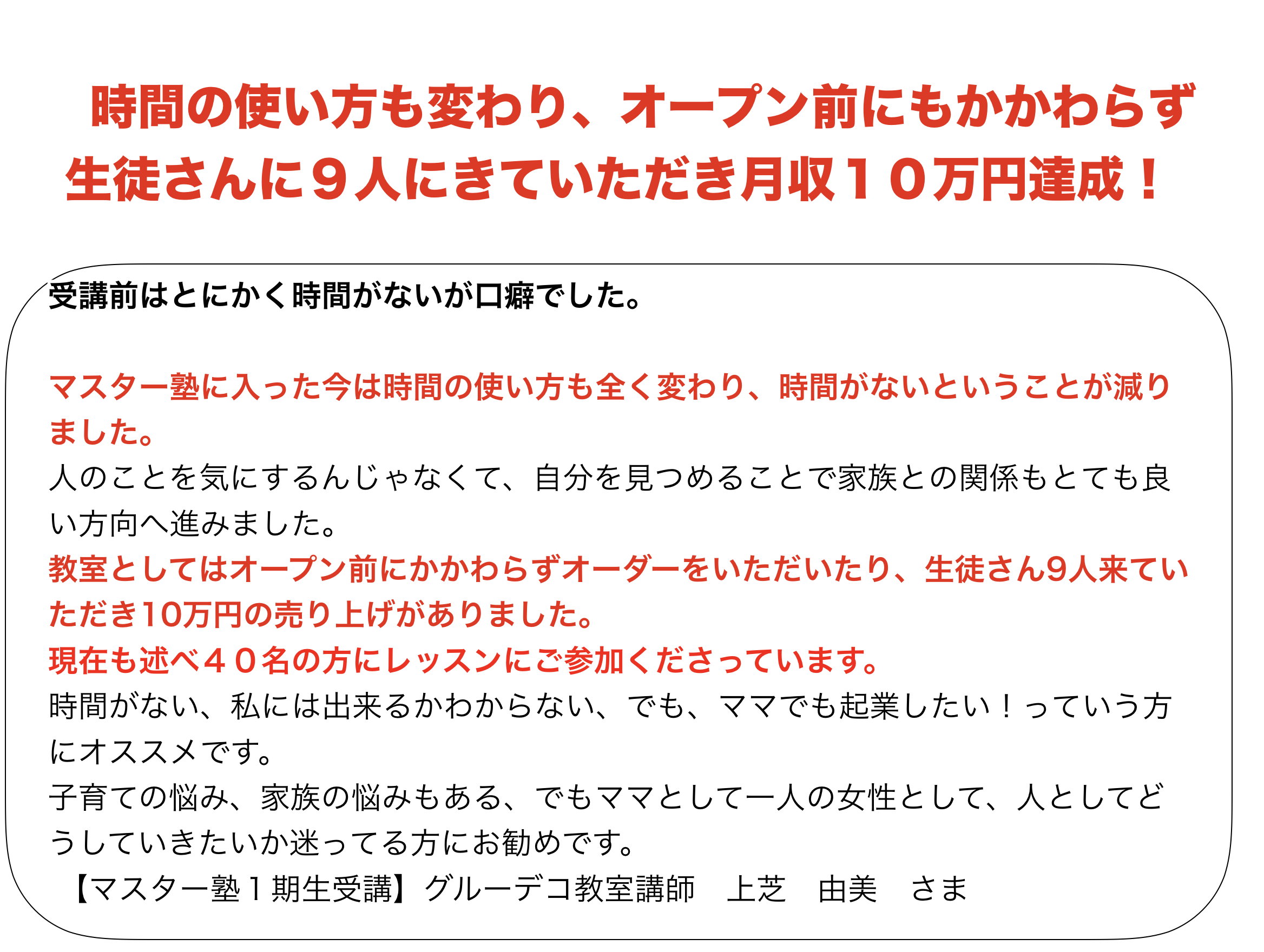 、私と同じようなママ起業家様が自分も子どもも大切にしながら、サクサク行動ができ、高単価商品を販売できるようになる1日が72時間になる魔法の時間活用術を構築し、月収240万を達成。